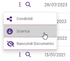 I documenti possono venire condivisi, scaricati, nascosti mediante il menu disponibile su ogni riga [4].