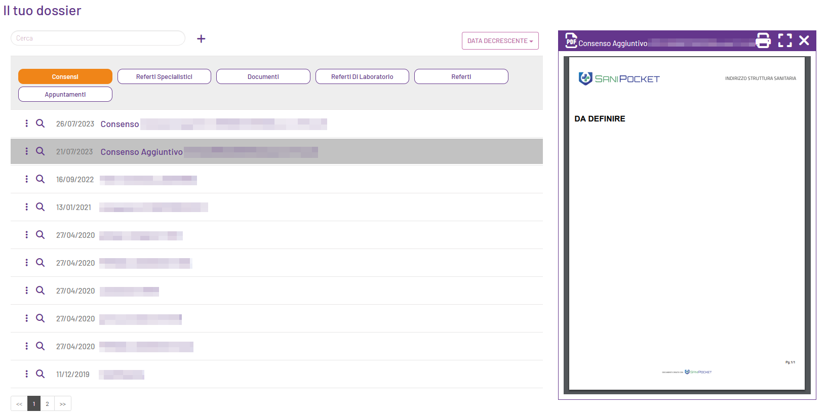 In questa sezione troverai i documenti caricati dalla tua Azienda Sanitaria: referti, ricevute, documenti, consensi relativi alla privacy.