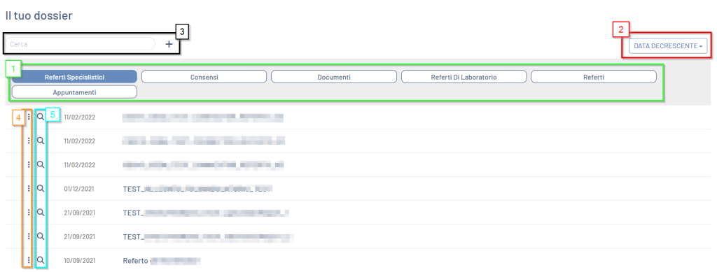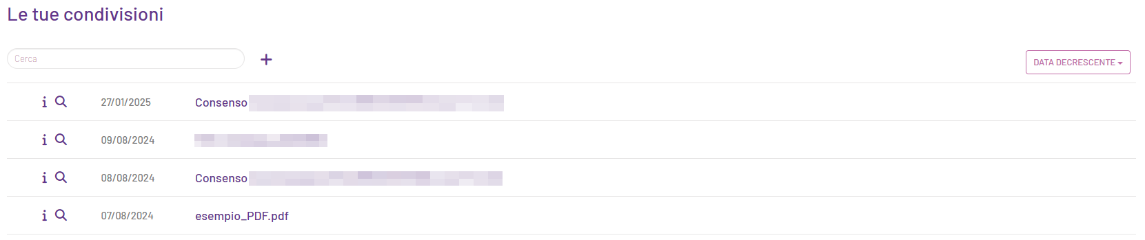 In questa sezione è possibile visualizzare i documenti condivisi con altre persone mediante l’apposita funzione presente nella sezione “Il tuo Dossier”. Le funzionalità di ricerca ed ordinamento sono le medesime di quella sezione.