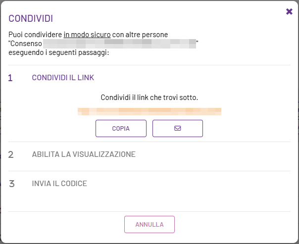 Cliccando invece il pulsante Condividi di nuovo si aprirà una modale contenente il link e il codice della condivisione, che si potranno riutilizzare, inviandoli al destinatario. Questa operazione non modifica la scadenza della condivisione.