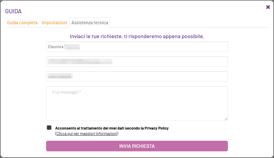 Questa sezione (presente nella modale Guida) permette di inviare direttamente al nostro Help Desk richieste di supporto, di informazioni od altro (ad esempio presentarci strutture sanitarie cui ci si rivolge, ma che non abbiano ancora aderito a SaniPocket).