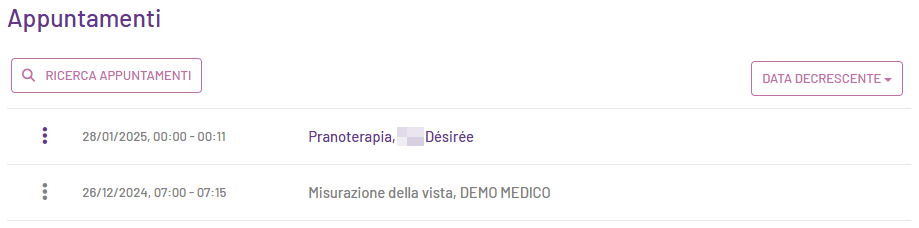 Le prenotazioni in blu sono attive, ovvero appartenenti ad una data corrente o futura, e permettono di effettuare azioni su di esse (cliccando sui tre puntini a fianco alla prenotazione). Attualmente è possibile disdire una prenotazione cliccando su Annulla prenotazione, solo se il paziente ha il DSE attivo