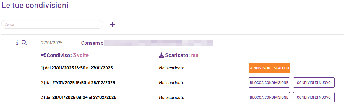Cliccando sulla “i” all’inizio della riga di un documento la riga si allargherà in altezza e verrà visualizzato l’elenco delle condivisioni effettuate per quel documento: